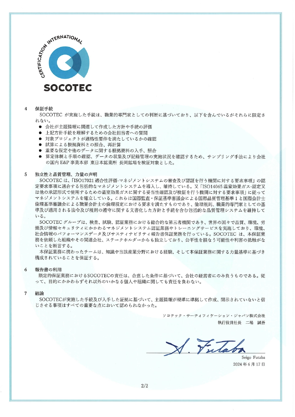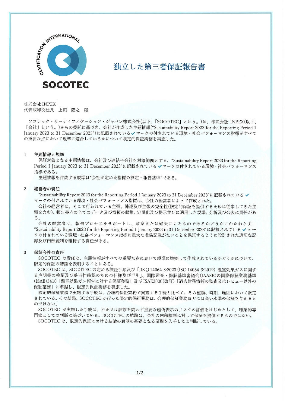 To ensure the reliability of environmental and social performance data included in Sustainability Report 2023, INPEX has obtained independent third-party assurance from SOCOTEC Certification Japan for all data marked with the symbol () in the ESG Performance Data section.