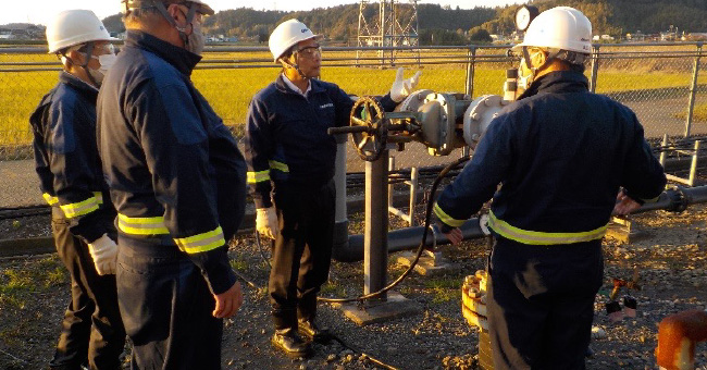 また、経営層がHSEへのコミットメントを示し、現場の作業に伴うリスクを直接理解した上で、INPEXバリューの一つである「安全第一」を実現するために、現場へのHSEマネジメントサイトビジットを実施しています。2021年度も新型コロナウイルス感染症(COVID-19)拡大の影響で出張が難しい状況ではありましたが、感染拡大ピークの合間を縫って、2021年7月には世田谷区の新寮建設工事現場、10月には埼玉県のパイプライン建設事業所及び栃木県の両毛ライン複線化第一期工事現場、そして11月には山形県の酒田天然瓦斯、千葉県の京葉パイプライン株式会社及び千葉鉱場の計6か所に対し、上田社長を始めとする担当役員によるサイトビジットを実施しました。新寮建設工事現場では、近隣住民への配慮、熱中症及び感染症予防対策が確認されました。両毛ライン工事現場と建設事業所では、工事現場で作業を行うコントラクター向けの入構者教育において、コーポレートの規則や指針などをまとめ、新たな入構者へ説明を行っていることが確認されました。酒田天然瓦斯では、HSEマネジメントシステムを導入し、着実に浸透を図っていることが確認されました。また、訪問した池田副社長からは緊急時対応訓練の重要性が強調されました。京葉パイプライン及び千葉鉱場へは上田社長が訪問し、過去の台風災害を教訓とした対策の実施が確認されました。